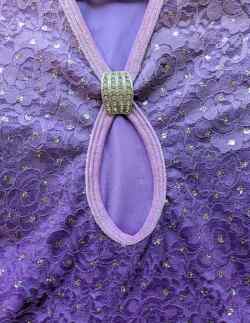背中はドロップ状にあけ、中心をクリスタルのモチーフで飾っています。